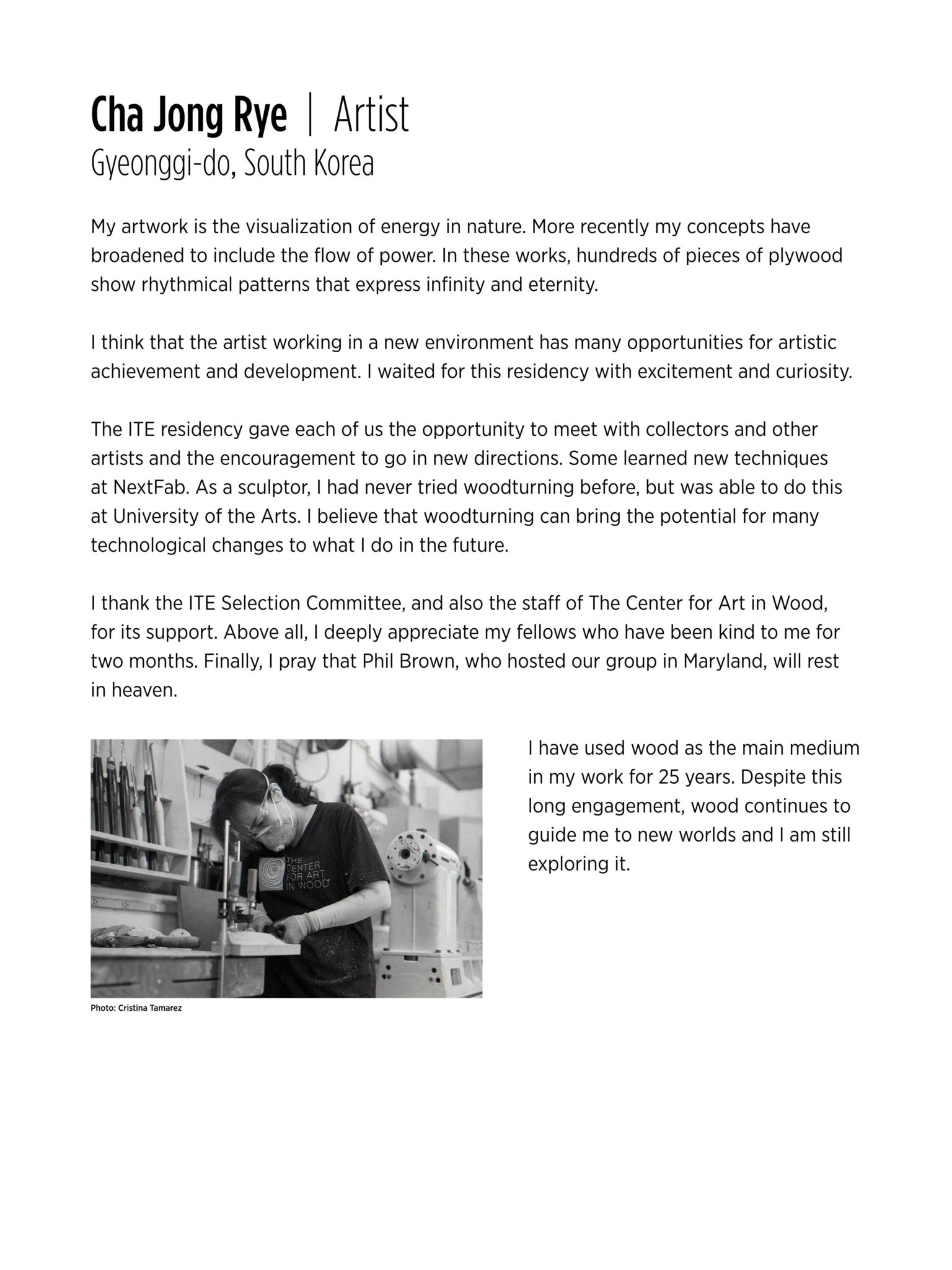 Cha Jong-Rye’s stimulus lies in nature and her own ongoing process where inspiration is self-perpetuating. The residency has allowed her to explore turning with guidance from those in the workshop. She has come with a truly open mind and cross-pollination, excitement, and enjoyment has flowed from this starting point.