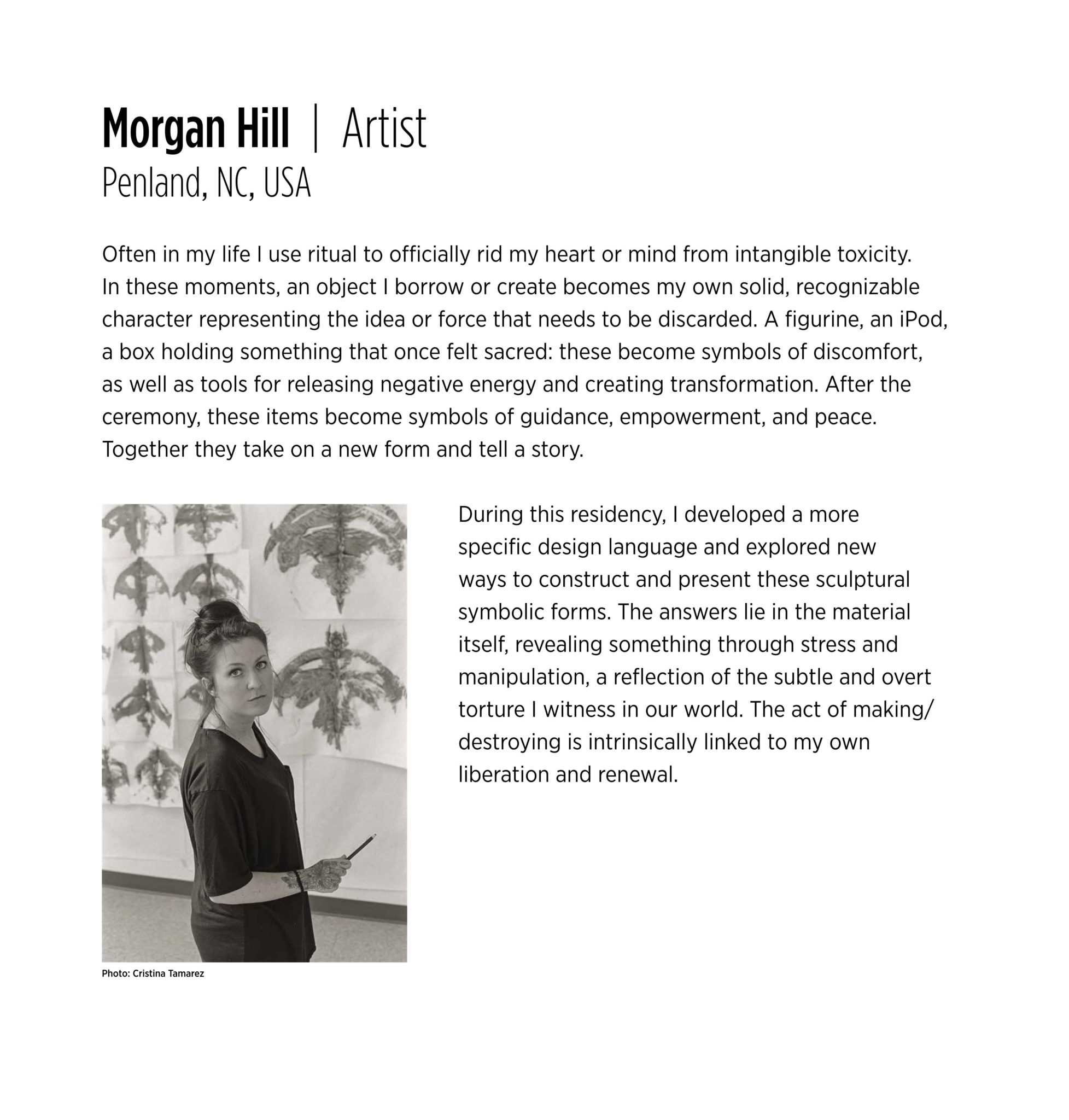 The support of the Center has enabled Morgan Hill to fully explore her practice with the provision of tools and space. The social aspect of the residency, the opportunity to discuss the ongoing work, is an important waylay in her process. The Studio Open Day provided a structured opportunity to gain insight into the voice of her work in the public perception.