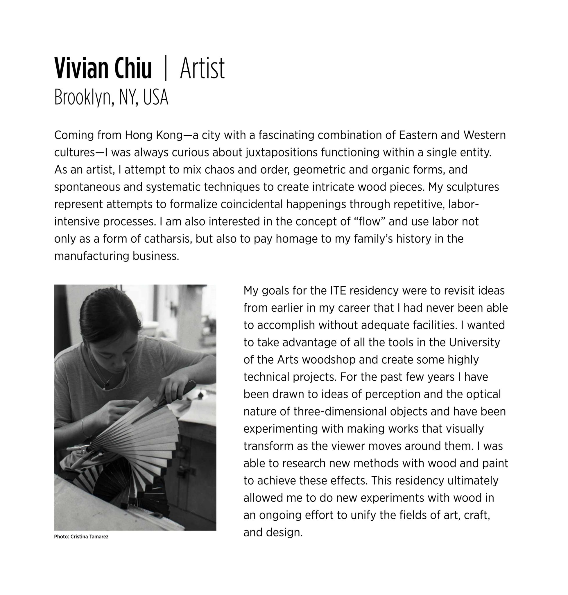 Now in its twenty-third year, the Center’s Windgate ITE International Residency program is a collegial experience that encourages an open exchange of creative and technical innovations in the field of art in wood. Throughout the summer, the resident fellows live at the University of the Arts and use studio space there and at NextFab where they can pursue both individual and collaborative work. The program culminates in the current exhibition, allTURNatives: Form + Spirit 2018. The 2018 residency experience was documented via their blog at https://internationalturningexchange.wordpress.com/ To learn more about the program, visit our Windgate ITE page.