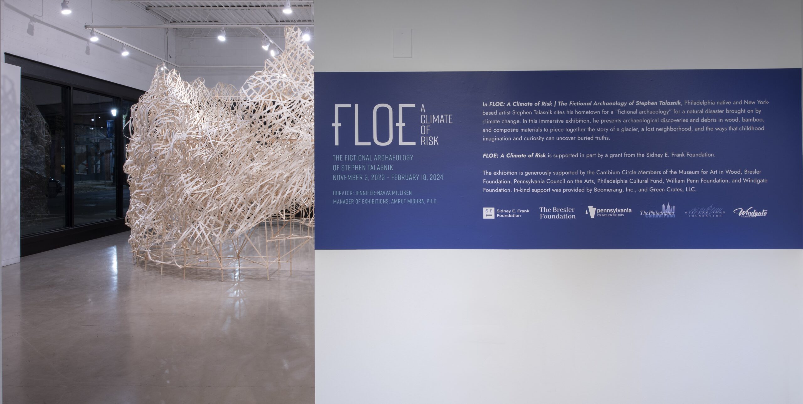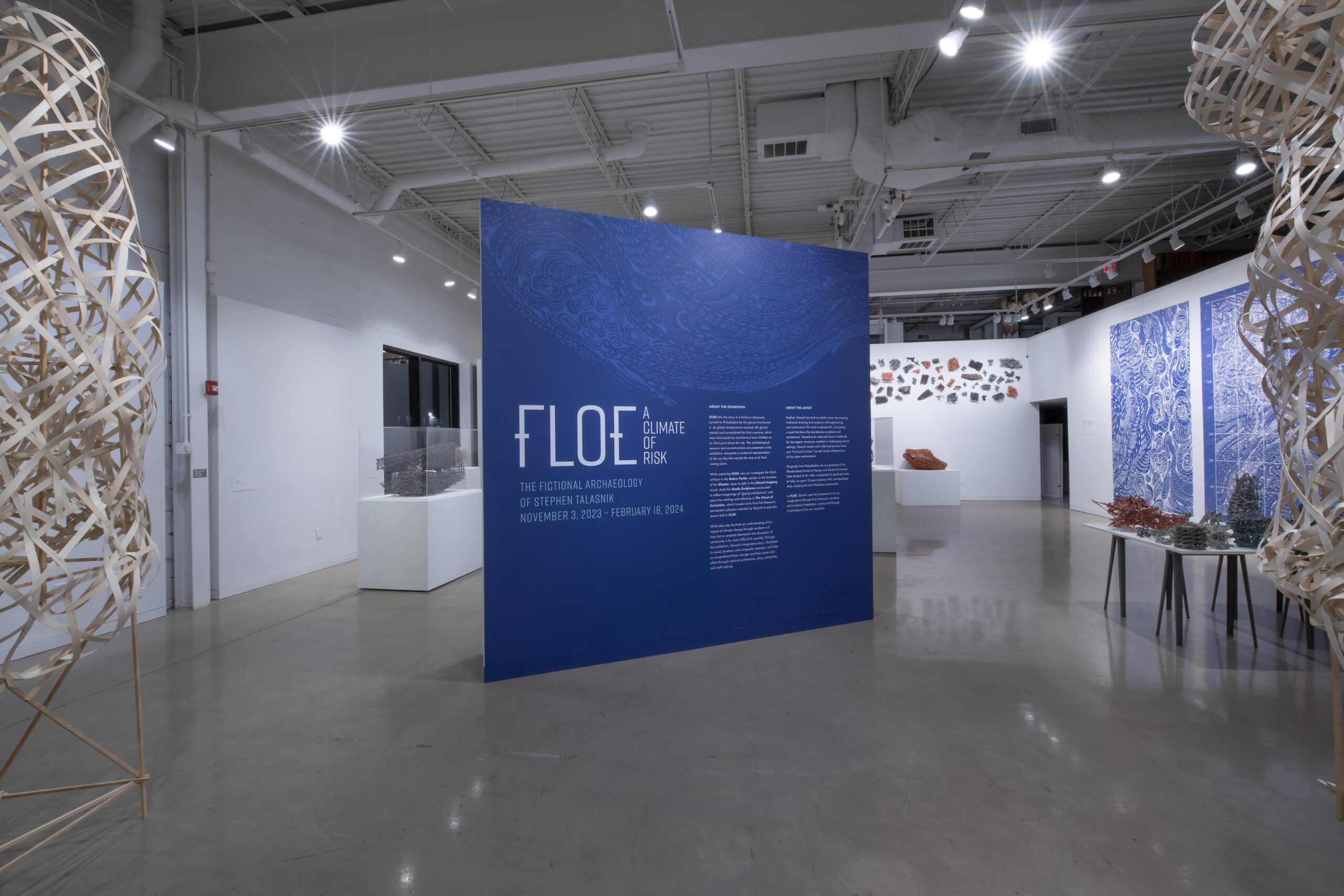 Stephen Talasnik has built an artistic career by exploring the links between drawing and building. His work is site-specific, occupying a scale that blurs the line between sculpture and architecture. In FLOE, Talasnik presents an imaginative and immersive installation that is simultaneously local and universal. Talasnik, who grew up and was educated in Philadelphia, poses his hometown to present a fictional account of a Philadelphia whose civilization was buried by a natural disaster brought on by climate change; the only evidence of this society is through the “archaeological collection” presented in the exhibition. Climate change is a problem that exposes the vulnerability of the world’s most defenseless populations, including the impoverished, house-less, and stateless, while the macro-financial stability of the region is threatened by shifts in global temperatures. While data facilitates understanding of this impact in terms of numbers, the potential loss to humanity is far more difficult to quantify. Through this exhibition, Talasnik’s account—illustrated in wood, bamboo, and composite materials—will help us understand this loss on the scale of the viewer.