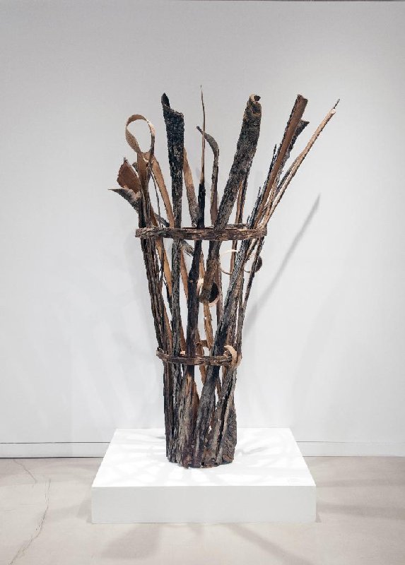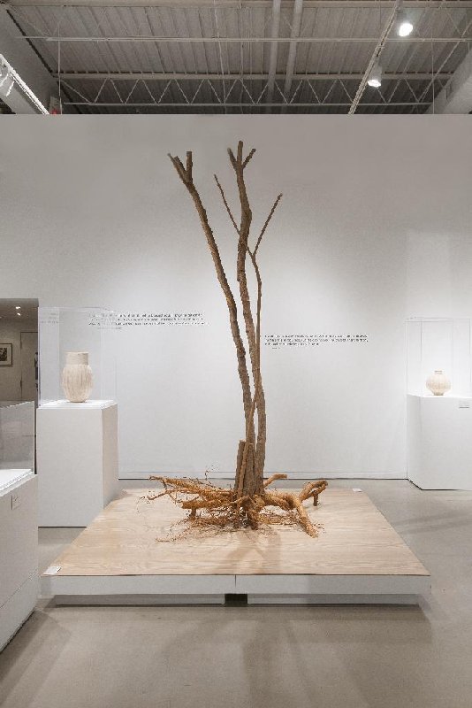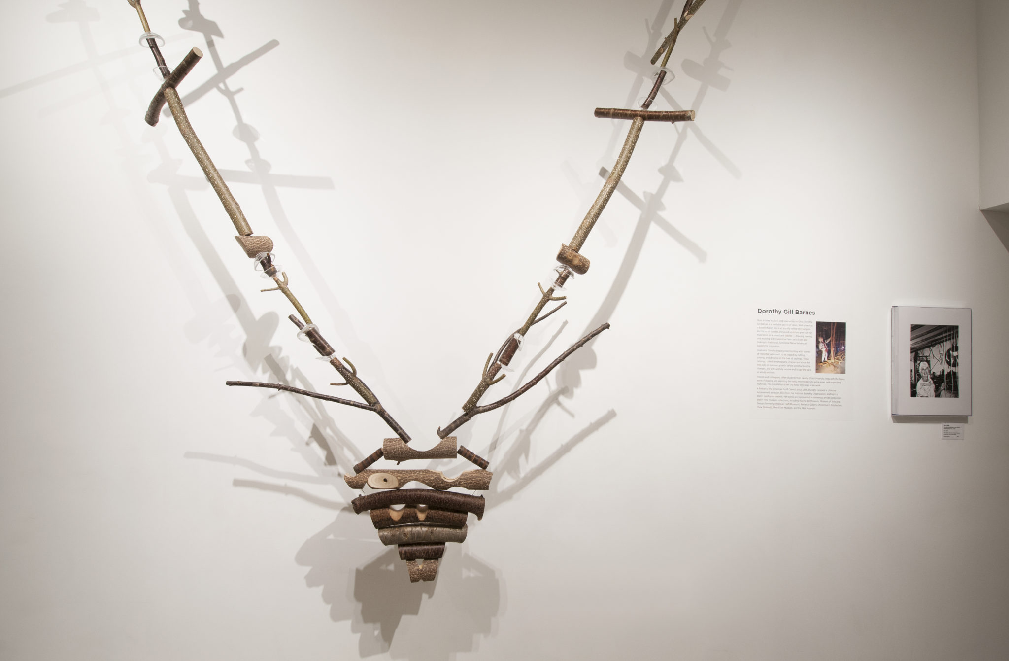 Born in Iowa in 1927, and now settled in Ohio, Dorothy Gill Barnes is a veritable geyser of ideas. Well known as a basket maker, she is an equally skilled tree surgeon. Her focus on baskets and wood sculpture grew out her experience as a parent and teacher – drawing, sewing, and weaving with maidenhair ferns on a loom and looking to traditional, functional Native American baskets for inspiration. Gradually, Dorothy began experimenting with stands of trees that were soon to be logged – cutting carving, and drawing on the bark of saplings. These carvings, called dendroglyphs, change quickly as the tree puts on summer growth. When she likes the changes, she will carefully remove and sculpt the bark or whole sections. Friends and colleagues, often students from nearby Ohio University, help with the heavy work of digging and exposing the roots, moving heavy trees to work areas, and organizing materials. This installation is her first foray into large scale work. A Fellow of the American Craft Council since 1999, Dorothy received a Lifetime Achievement award in 2015 from the National Basketry Organization, adding to a dozen prestigious awards. Her works are represented in numerous private collections and in nine museum collections, including Racine Art Museum, Museum of Arts and (formerly American Craft Museum), Renwick Gallery, Christchurch Polytechnic (New Zealand), Ohio Craft Museum, and the Mint Museum