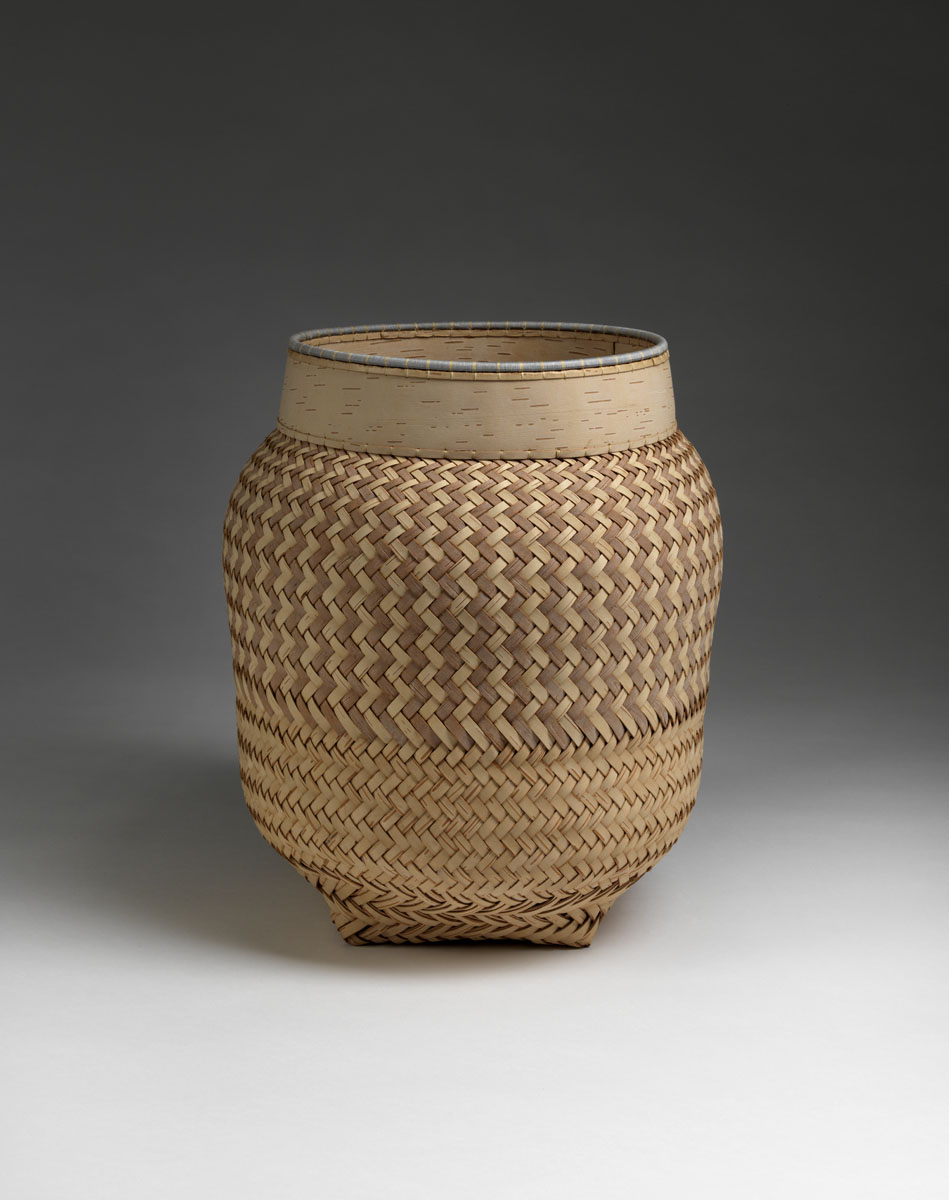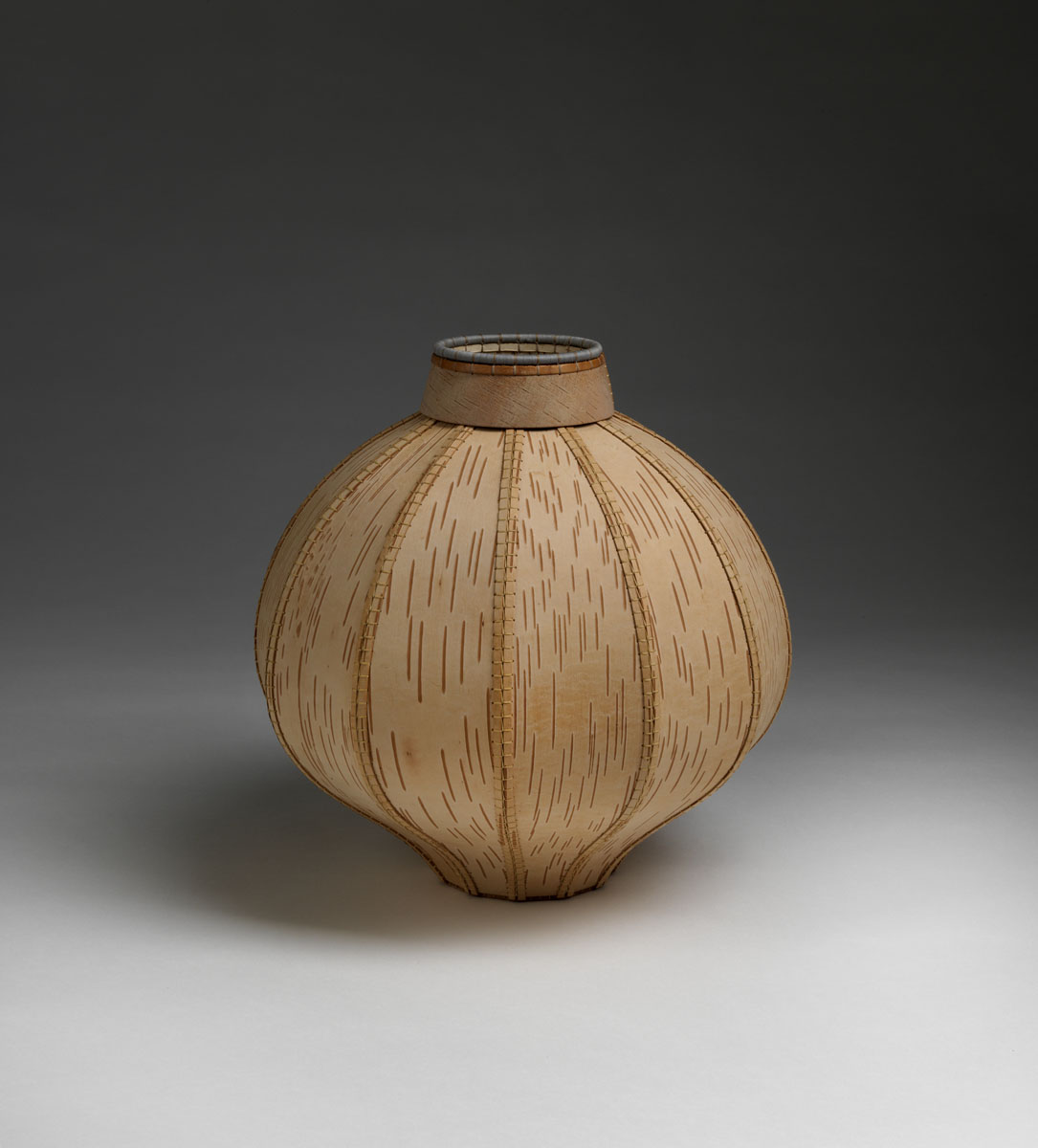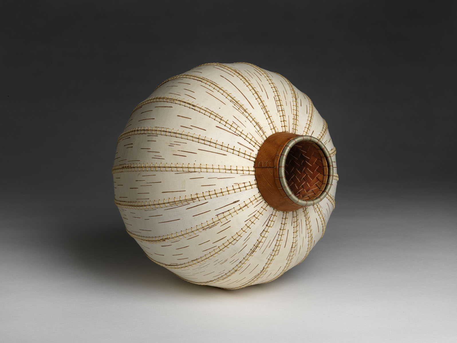 Dona Look has been weaving baskets for the past forty years, finding her materials in the forests of her native Wisconsin. With bark from local birch trees, she weaves baskets and sews them together with silk thread. Dona searches for bark among large, healthy trees that will soon be logged—evaluating the diameter of each tree and the bark’s thickness, its unique markings and flexibility. The body of each piece is often made of bark from one tree. Often the interiors are intricately woven. Collecting must be done in the spring when the sap is running. She peels the dirty outer layer off along with an inner layer to store the pieces flat. Collecting and preparation of birch bark is weather dependent and never easy, but has become increasingly difficult of late. White birch trees, once prevalent in northern Wisconsin forests, are harder to find as the climate changes. Dona has received two fellowships from the National Endowment of the Arts and her work is represented in the collections of the Museum of Arts and Design (formerly American Craft Museum), Renwick Gallery, Philadelphia Museum of Art, Metropolitan Museum of Art, the White House Collection, Arkansas Arts Center, Racine Art Museum, and Yale University Art Gallery. This exhibition runs concurrently with Wendy Maruyama: The wildLIFE Project.